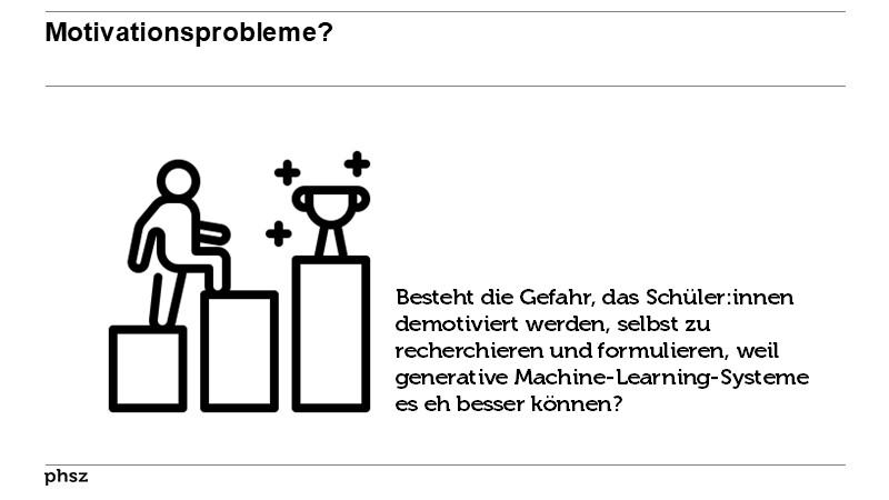 wenn Lernende den Eindruck haben, Aktivitäten ausüben zu müssen, die eine KI übernehmen könnte.Meine These: ChatGPT ruiniert das Motivationsgefüge des herkömmlichen Unterrichts. Motivation ist das Rückgrat des Lernprozesses – das sagt nicht nur Abraham Maslow.