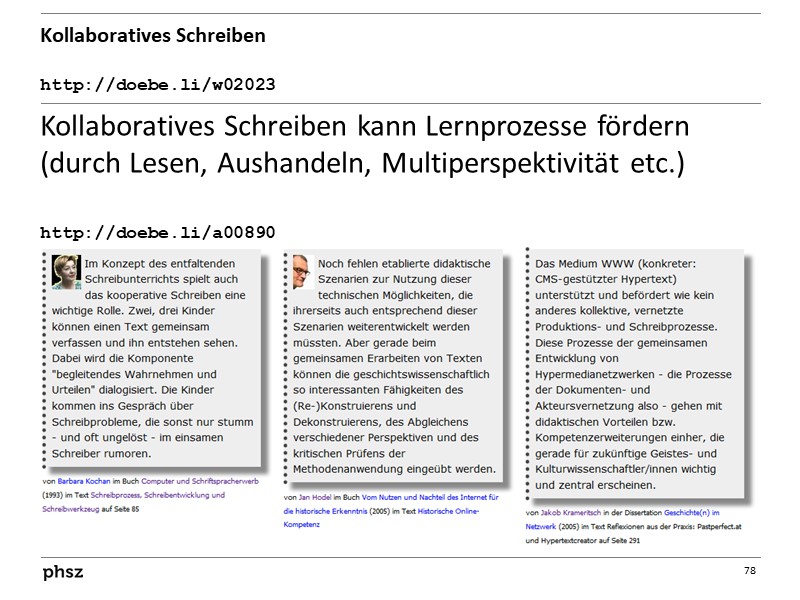 Noch fehlen etablierte didaktische Szenarien zur Nutzung dieser technischen Möglichkeiten, die ihrerseits auch entsprechend dieser Szenarien weiterentwickelt werden müssten. Aber gerade beim gemeinsamen Erarbeiten von Texten können die geschichtswissenschaftlich so interessanten Fähigkeiten des (Re-)Konstruierens und Dekonstruierens, des Abgleichens verschiedener Perspektiven und des kritischen Prüfens der Methodenanwendung eingeübt werden.