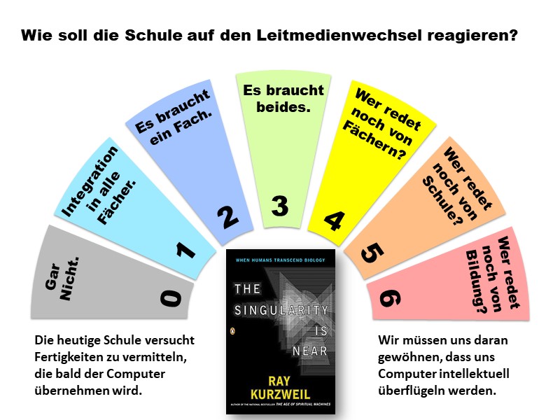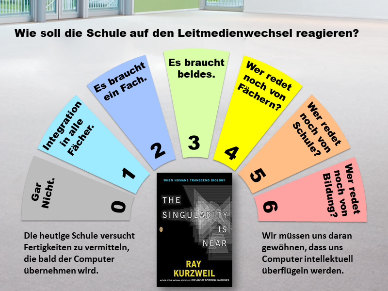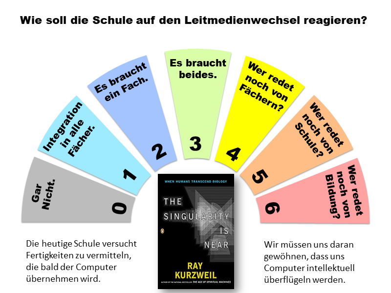 singularity points, d.h. dem Zeitpunkt an welchem die Rechenleistung aller Computer auf der Welt die Rechenleistung eines menschlichen Gehirns erreicht. Spätestens zu diesem Zeitpunkt werde es nicht mehr darum gehen, die Bildung von Menschen zu optimieren, sondern das Zusammenleben von Menschen mit intelligenten Robotern.