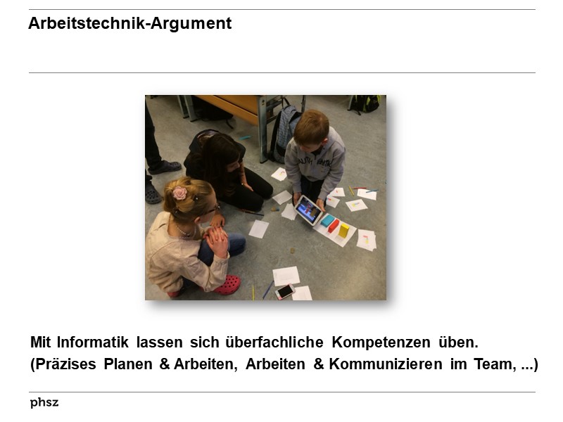 im Team üben. Selbstverständlich bietet nicht nur Informatik diese Möglichkeit, das Arbeitstechnikargument zeigt jedoch,dass Informatik neben der Ausbildung von Fachkompetenzen auch zur Weiterentwicklung überfachlicher Kompetenzen beitragen kann.