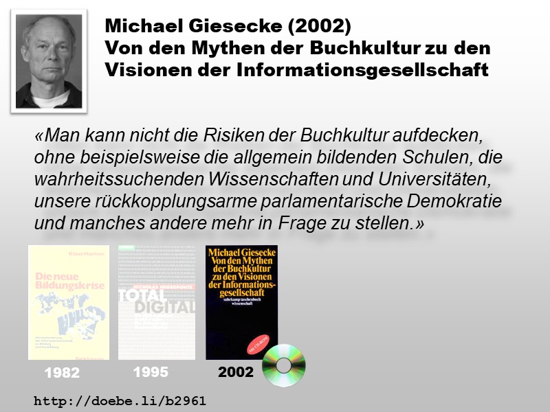 Der Medientheoretiker Michael Giesecke beschäftigt sich in seinem Werk „Von den Mythen der Buchkultur zu den Visionen der Informationsgesellschaft“ mit