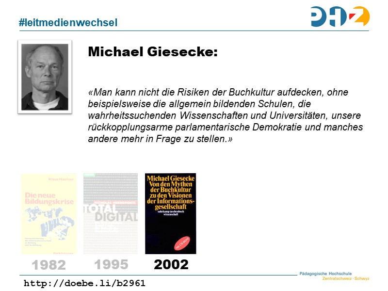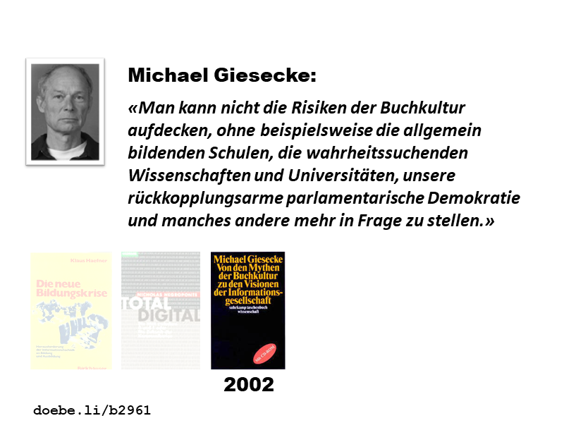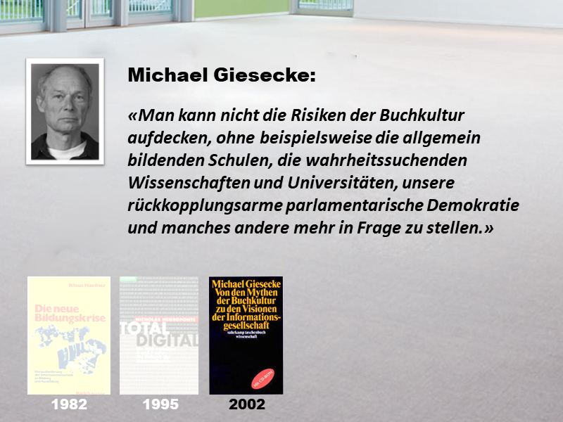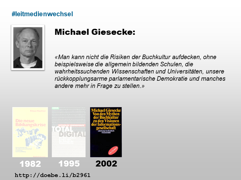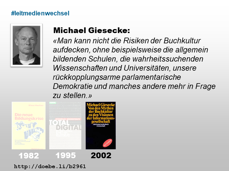 den Auswirkungen des Buchdrucks auf Wirtschaft, Gesellschaft und Bildung. Gemäss Giesecke kann ein Wechsel des Leitmediums vom Buch zum Computer