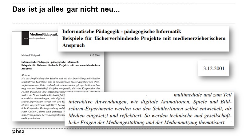 ![]() | Informatische Pädagogik - pädagogische Informatik. Beispiele für fächerverbindende Projekte mit medienerzieherischem Anspruch: Artikel als Volltext bei medienpaed.com ( : , 1075 kByte; : 2021-03-21) |