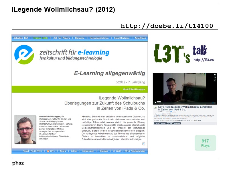 Wieder einen Gang zurück schaltet Beat Döbeli Honegger von der „erweiterten Realität“ für Bildung generell in die Realität der Klassenzimmer heutiger Schulen, von denen erst wenige über Erfahrungen mit mobilen Endgeräten berichten können. Unter dem Titel „iLegende Wollmilchsau? Überlegungen zur Zukunft des Schulbuchs in Zeiten von iPads & Co.“ vergleicht er aktuelle Medienberichte, die große Umwälzungen im Schulalltag suggerieren, mit der tatsächlichen Situation in der Schule und kommt zu dem Schluss, dass das gedruckte Schulbuch nicht so schnell verschwinden und durch verschiedene E-Lehrmittel ersetzt sein wird. Neben nüchternen Klarstellungen fragt Döbeli Honegger aber auch nach den Potenzialen, welche die Digitalisierung speziell für Schulbücher mit sich bringt. Diese liegen keineswegs nur in einer höheren Effizienz, sondern vor allem auch darin, dass traditionelle Bücher multimedial, interaktiv und sozial erweitert und in Lernumgebungen auf unterschiedliche Weise integriert werden können.