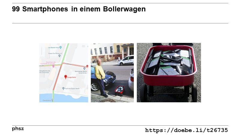 99 smartphones are transported in a handcart to generate virtual traffic jam in Google Maps.Through this activity, it is possible to turn a green street red which has an impact in the physical world by navigating cars on another route to avoid being stuck in traffic. #googlemapshacks