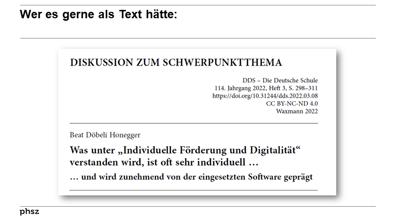 ![]() | Was unter «Individuelle Förderung und Digitalität“ verstanden wird, ist oft sehr individuell...: Artikel als Volltext ( : , 244 kByte; : ) |