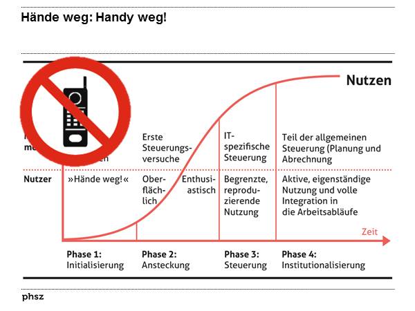 ICT & School OrganisationBei der heutigen Entwicklung im Bereich mobiler Geräte (Smartphones, Subnotebooks u.a.) deutet alles darauf hin, dass in absehbarer Zeit die grosse Mehrheit aller Lernenden über persönliche Computer verfügt. Schon heute besitzen fast alle Kinder und Jungendliche ein Handy. Schulen sind von solchen Phänomenen überrascht worden und mit diesen Herausforderungen überfordert. Sie reagieren im Normfall reaktiv mit Verboten und Sanktionen auf solche Entwicklungen.