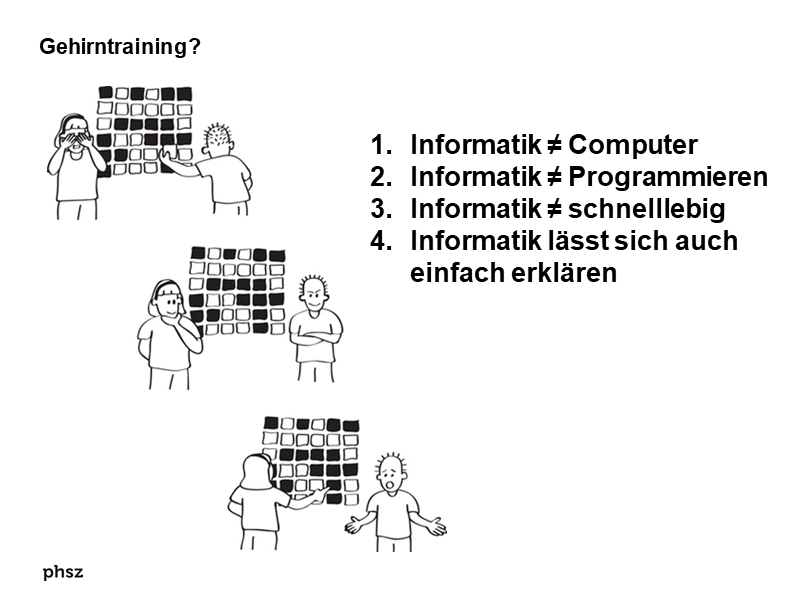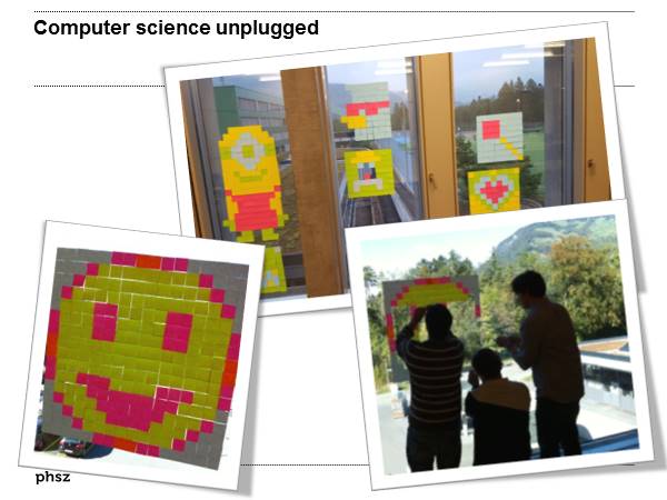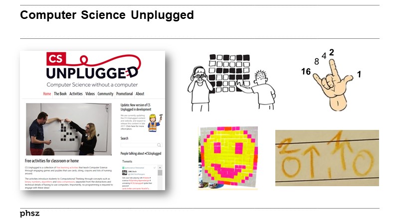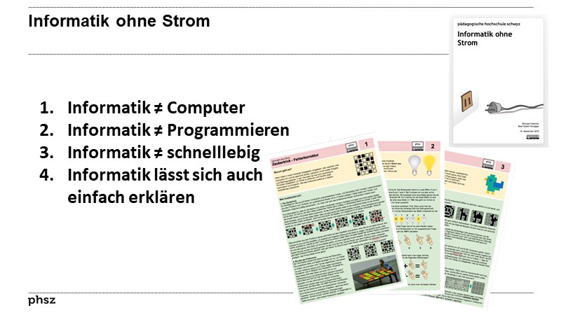 Beat Döbeli HoneggerDie Idee, grundlegende Konzepte der Informatik ohne Computer zu erklären wurde von Bell und Witten unter dem Titel computer science unplugged populär gemacht (http://csunplugged.org; Bell, Bensemann & Witten, 1995; Bell, Witten & Fellows, 2006) und erlebt in den letzten Jahren in der Informatik-Fachdidaktik eine eigentliche Blüte.
