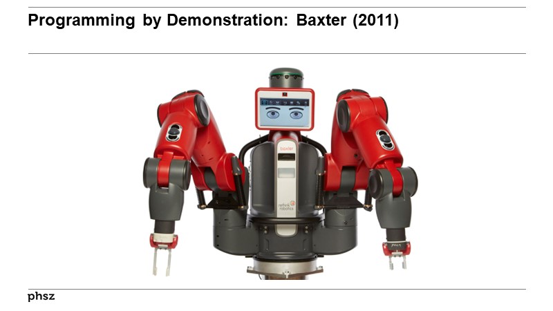 Baxter ist ein dem menschlichen Oberkörper nachempfundener Roboter mit zwei Armen und einem Bildschirm als »Kopf«. Darauf kann ein Gesicht angezeigt werden, das dorthin blickt, wo der Roboter demnächst etwas tun wird und das Traurigkeit oder Verwirrtheit ausdrückt, wenn dem Roboter etwas nicht gelingen will. Das Revolutionäre ist jedoch, dass Baxter sich programmieren lässt, indem man seine Arme greift und ihm damit vormacht, was er zu tun hat. Nach etwa einer halben Stunde Training hat er verstanden, was er zu tun hat, und kann nun beispielsweise selbstständig Objekte in Kisten verpacken oder Nägel an einer bestimmten Stelle einschlagen. Dieses programming by demonstration ermöglicht es auch Laien, den Roboter zu programmieren – teure und rare Programmierer werden damit überflüssig. Ähnlich wie der Computer ist er damit kein Werkzeug nur für einen bestimmten Zweck, sondern ein lernfähiger Universalroboter.