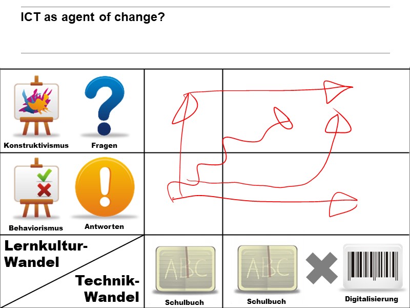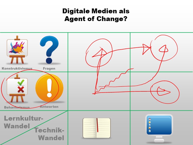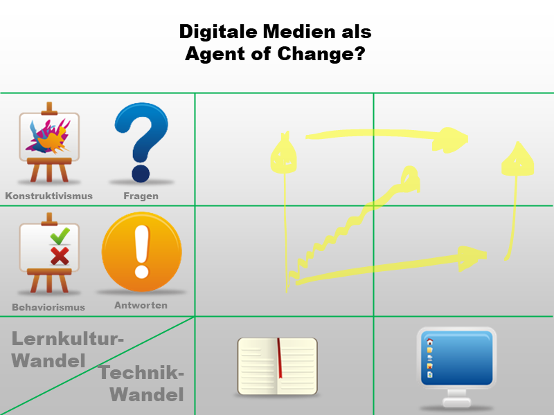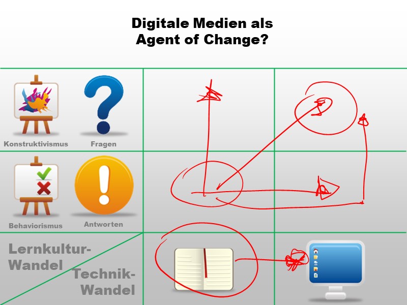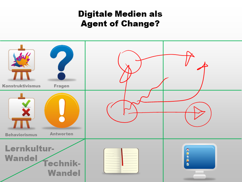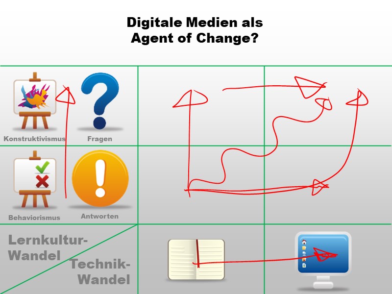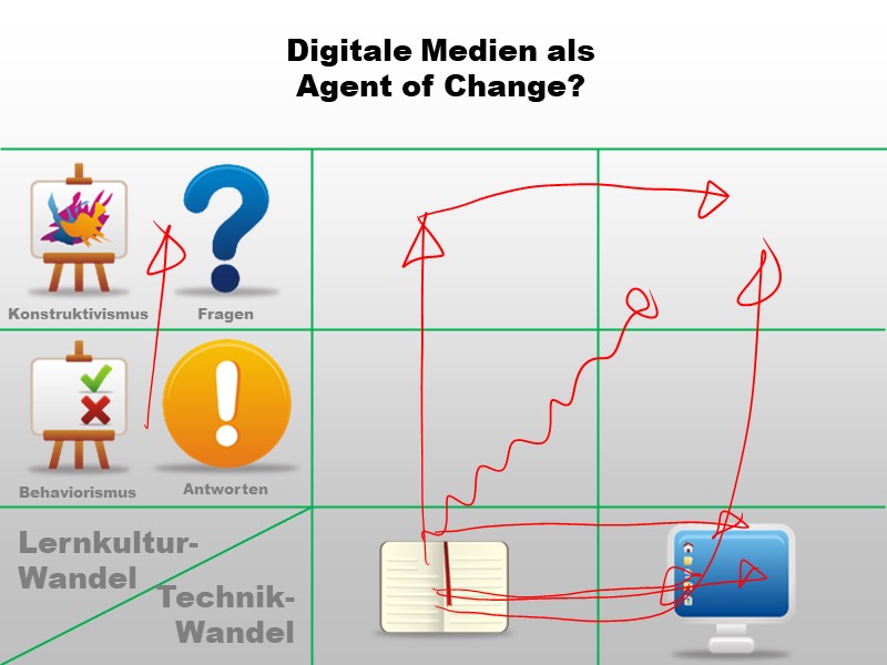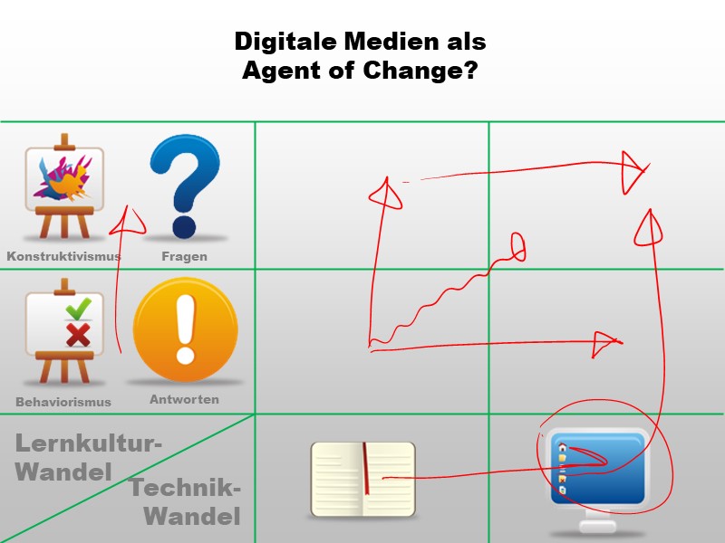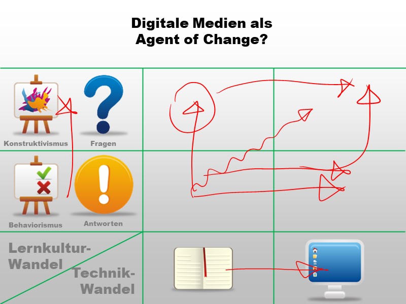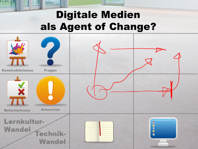 Zwar beabsichtigen die InitiatorInnen eines Digitalisierungsprojekts in der Schule eventuell nur einen technologischen Wandel - die Geräte allerdings werden einen Lernkulturwandel erzwingen (weil sich z.B. zeigt, dass bei Frontalunterricht die beschaffte 1:1-Ausstattung eher stört als hilft)