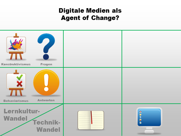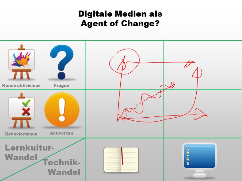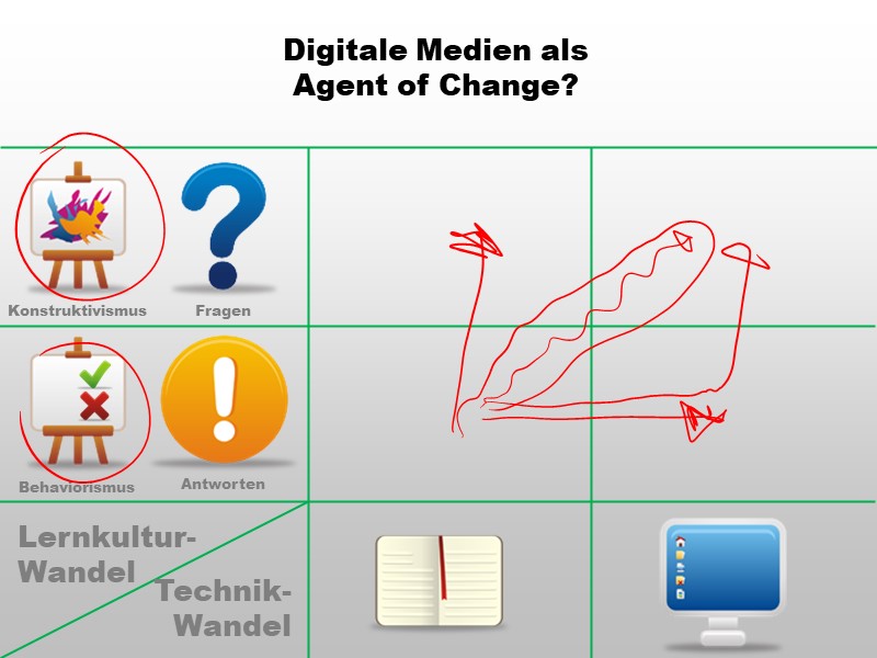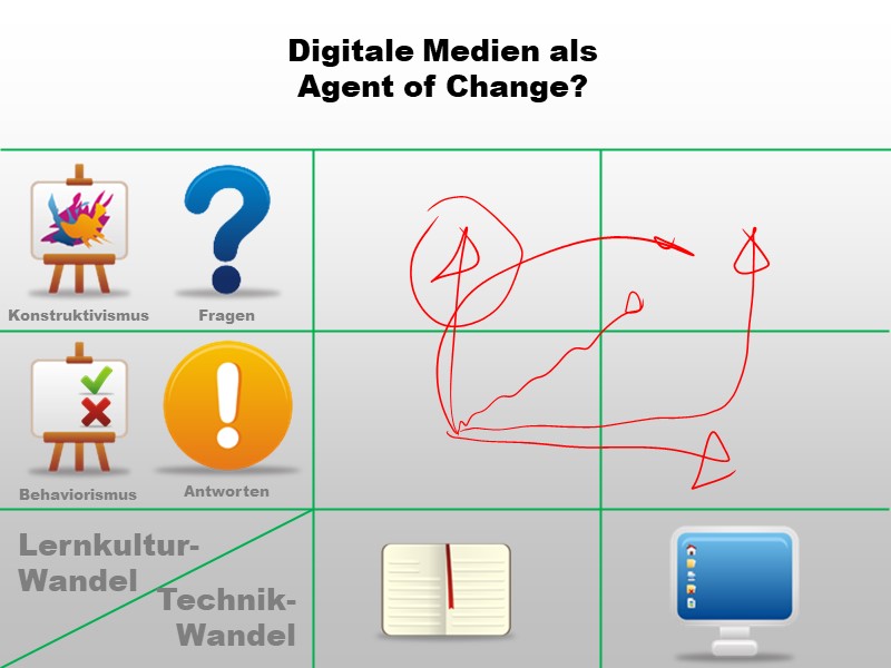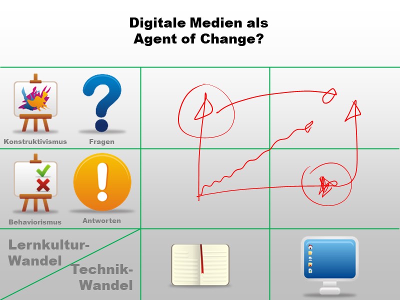 Katalysator-These und Trojaner-These bewirken letztendlich beide das Gleiche: Eine Änderung der Lernkultur. Meine Definitionen der beiden Begriffe unterscheiden sich bezüglich der Absicht, die bei der Beschaffung digitaler Infrastruktur vorhanden war.- Bei der Katalysator-These ist die Veränderung der Lernkultur geplante Absicht - Digitale Infrastruktur wird zur Verfügung gestellt, damit sich die Lernkultur hin zu einer konstruktivistischeren Auffassung bewegt.