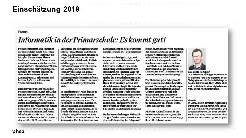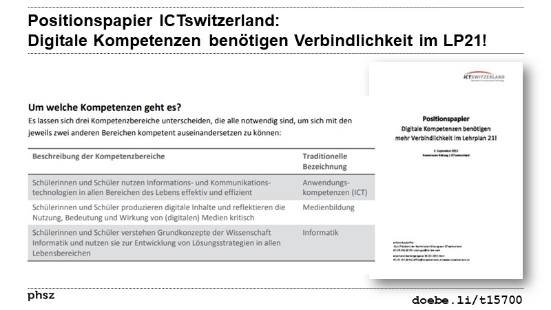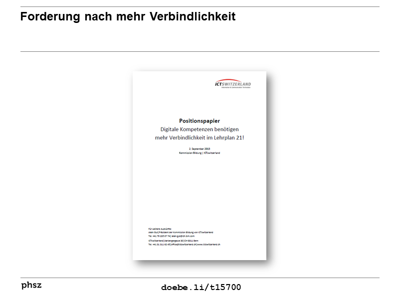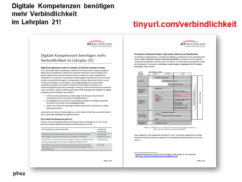 ![]() | Schlussbericht der Arbeitsgruppe zu Medien und Informatik im Lehrplan 21: Artikel als Volltext ( : , 4990 kByte; : Link unterbrochen? Letzte Überprüfung: 2020-11-28 Letzte erfolgreiche Überprüfung: 2018-11-28) |