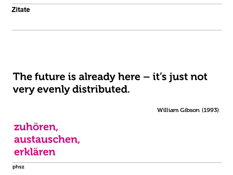 Drei Zitate als Leitlinien. Die Erfahrung der letzten 25 Jahre hat uns öfters gezeigt, dass wesentliche Erkenntnisse und Zukufntstechnologien eigentlich bereits seit längerem vorhanden sind, aber sich im Bildungsbereich nicht verbreiten. Es geht deshalb bei der digitalen Transformation in der Bildung nicht nur darum, grundlegend neue Erkenntnisse zu machen, sondern vor allem auch darum, diese Erkenntnisse zu verbreiten und anzuwenden.